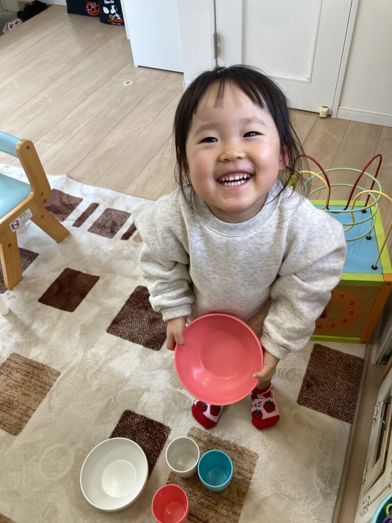 「ピンクのお皿にする!赤ちゃんのは青で…」とお皿の色をわけて、3人分おままごとで料理してくれました