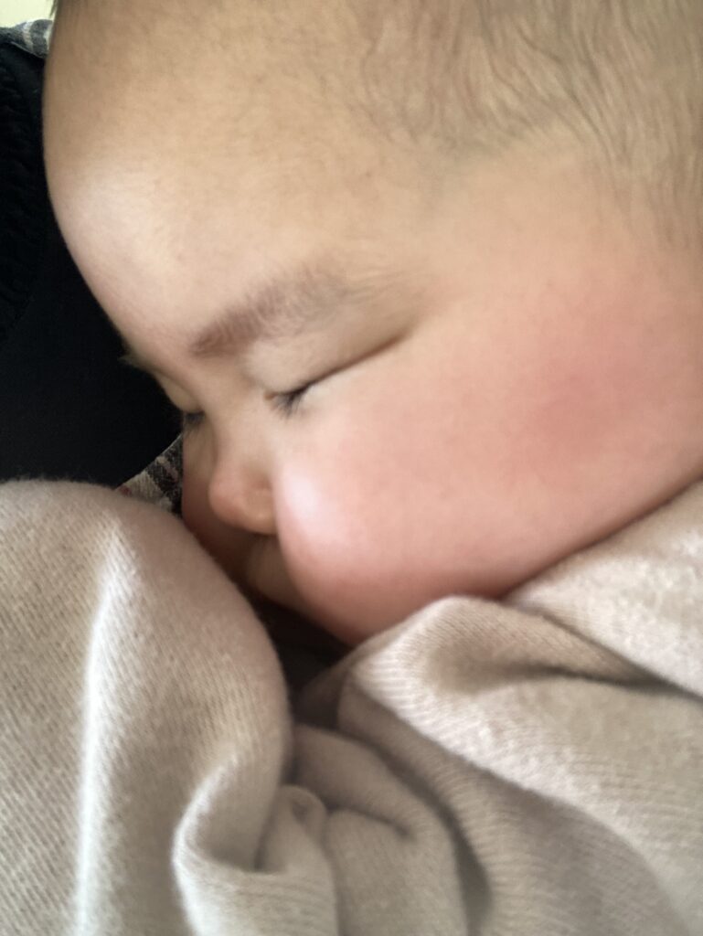しばらくしてから、そぉっとツンツンと触っていましたが、その後もう一度泣いてから、うとうとお昼寝タイムになりました…