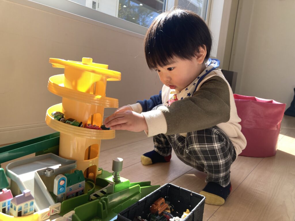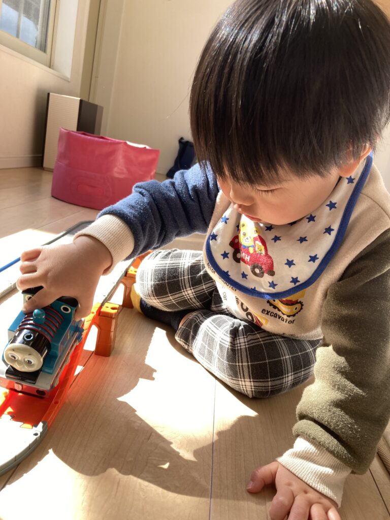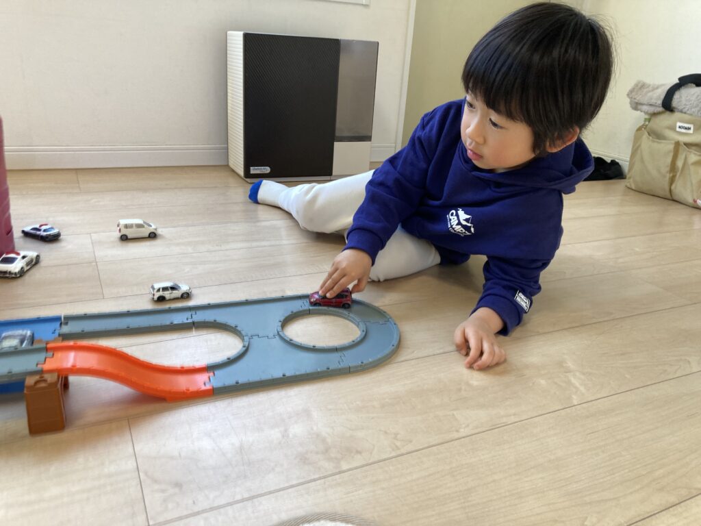 大好きなトミカでも遊び、プラレールでも遊んでいました