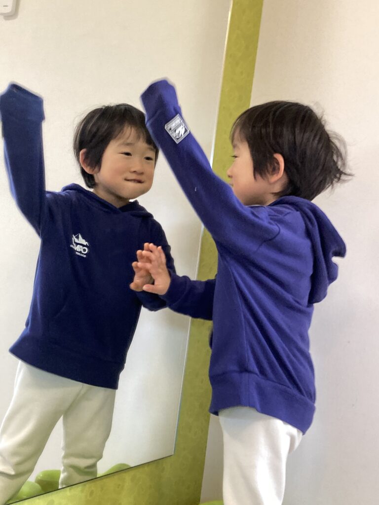 バンボに座ったり、鏡の前で変顔してみるのも、恒例の遊びです♪ 慣れた様子でいろいろ楽しそうに遊んでくれるので、とっても嬉しいです
