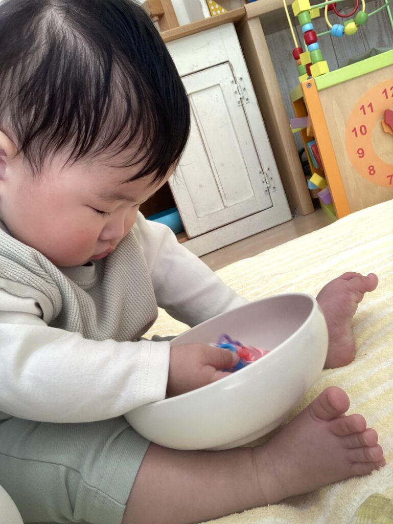 座った姿勢で、おもちゃをふりふりして、じっくり遊んでいました