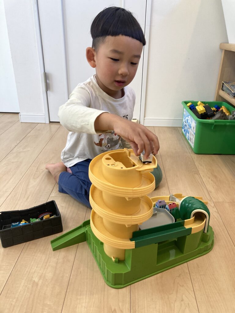 窓からお母様が見えることを伝えると、確認して安心したみたいで、トーマスで遊び始めました