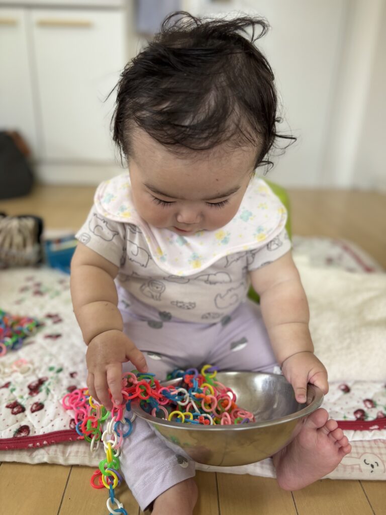 何度も何度も触ってはお皿に入れて出して集中して繰り返し、他のおもちゃを見せてもチェーンリングにまっしぐら