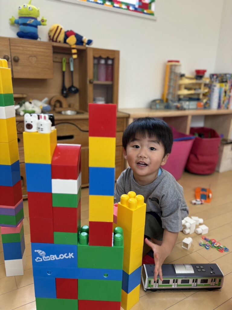 託児に入室する時いつもお家の方と離れるのが寂しくなってしまい、一旦後退りしますが、すぐに笑顔になりお話をたくさんしてくれます