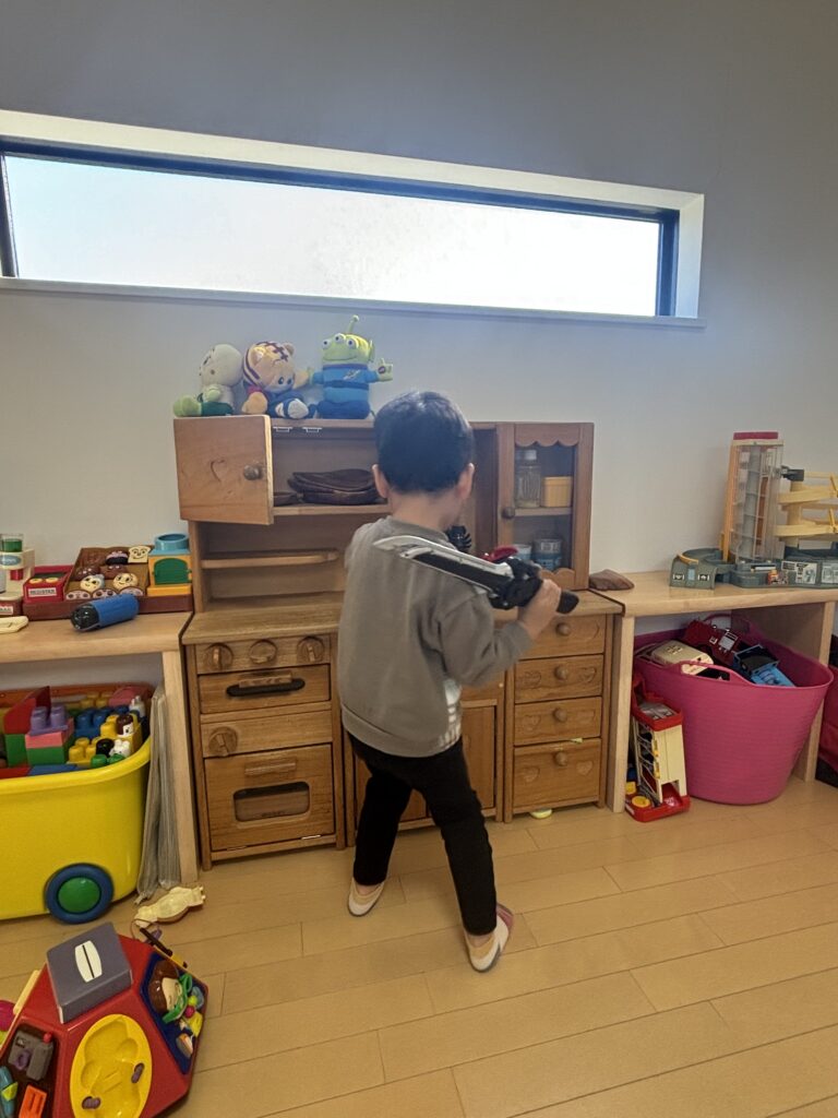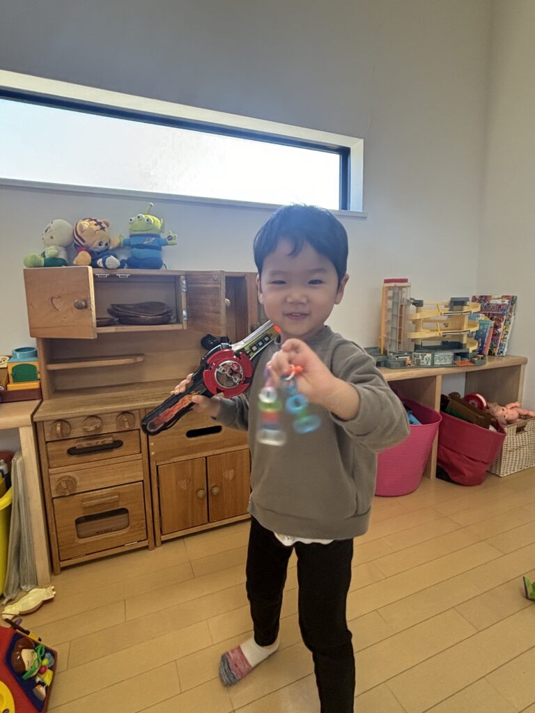 お気に入り二つ目のおもちゃは戦隊の剣。剣を片手におままごと♡