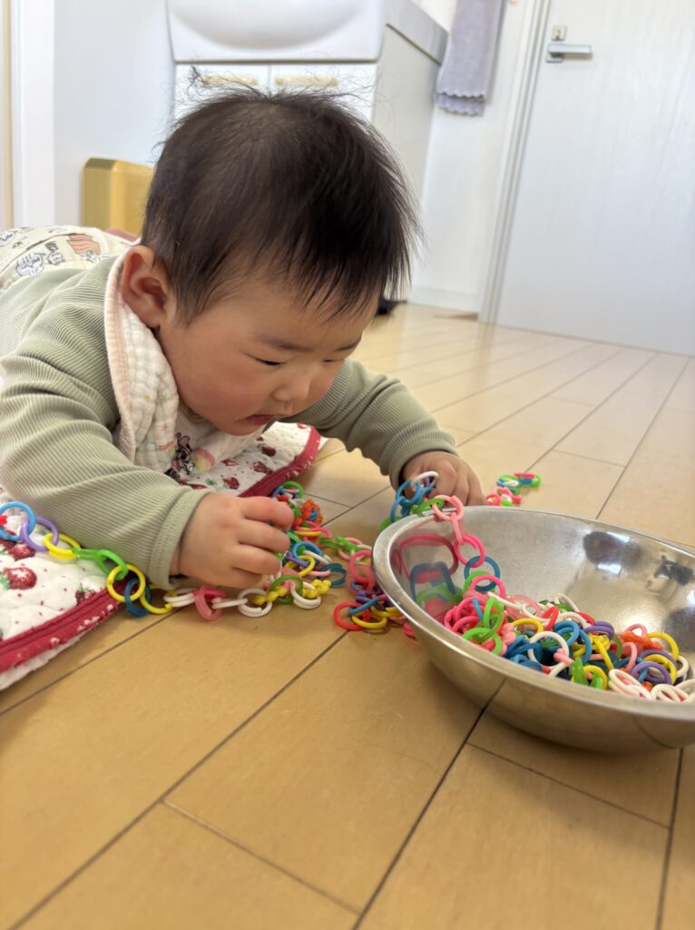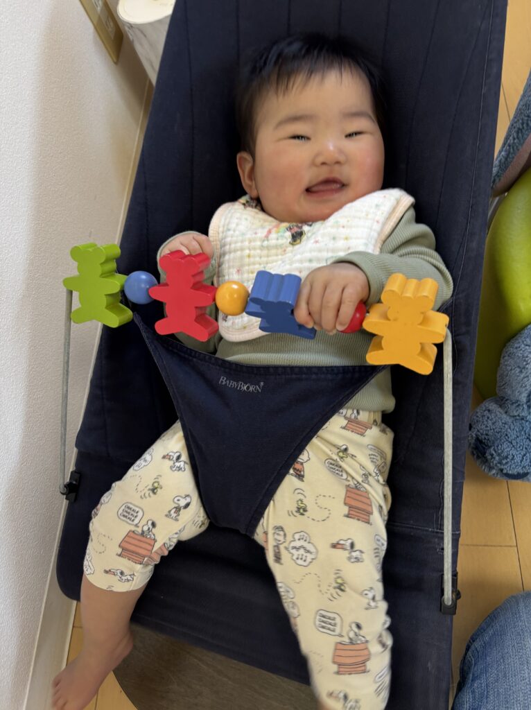 投稿日: 2025年1月17日2025年1月17日 投稿者: oazo託児の様子 大柳店 R7.1.17 「浜松市にある無料託児付き美容室oazo大柳店の保育士たけしたです」 初めましての6ヶ月のお子様が託児をご利用頂きました。 おうちの方から眠いかも!とお話しありましたが、声をかけるとニコニコ☺️ バウンサーで足をいっぱい動かしてご機嫌さん🩷 お話もしてくれて、窓から見える木々の揺れをよーくみていました 上手に寝返りもできます チェーンリングがお気にいりで沢山遊びました。 ずり這いもすぐしそうなくらい元気です。 またお会いできるのを楽しみしております。