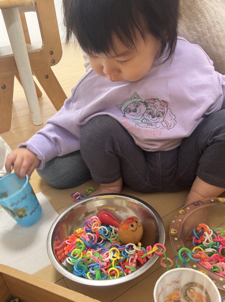 でも抱っこはさせてくれるので、私のお膝の上にのり遊びました。調子が出てくるとどんどん歩いて好きなおもちゃをとりにいきます。