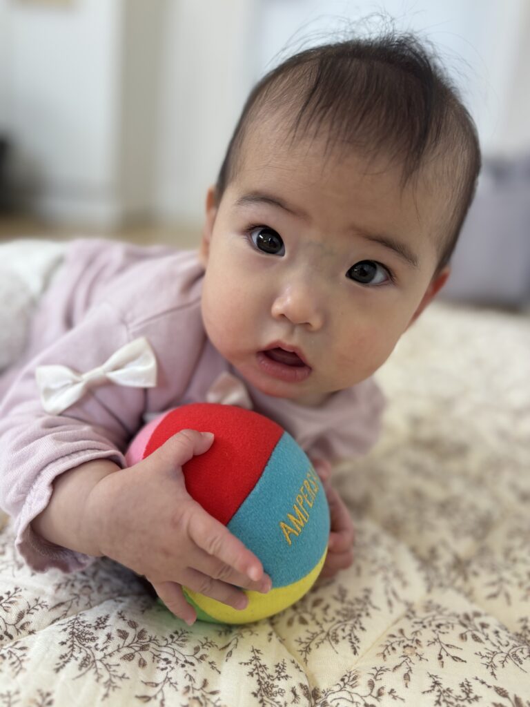 ふわふわのボールを気に入ってくれて両手で掴んでみたり、感触を確かめたりして過ごしました。