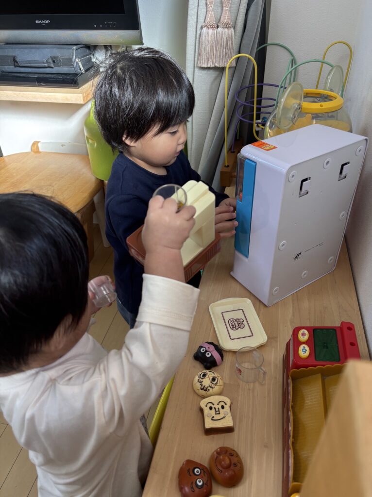 時間が経つと、少しずつ意思の主張も出て取り合いになることも。それも見守り少しアドバイスすることでどちらも楽しく託児のお時間を過ごすことができだと思います!