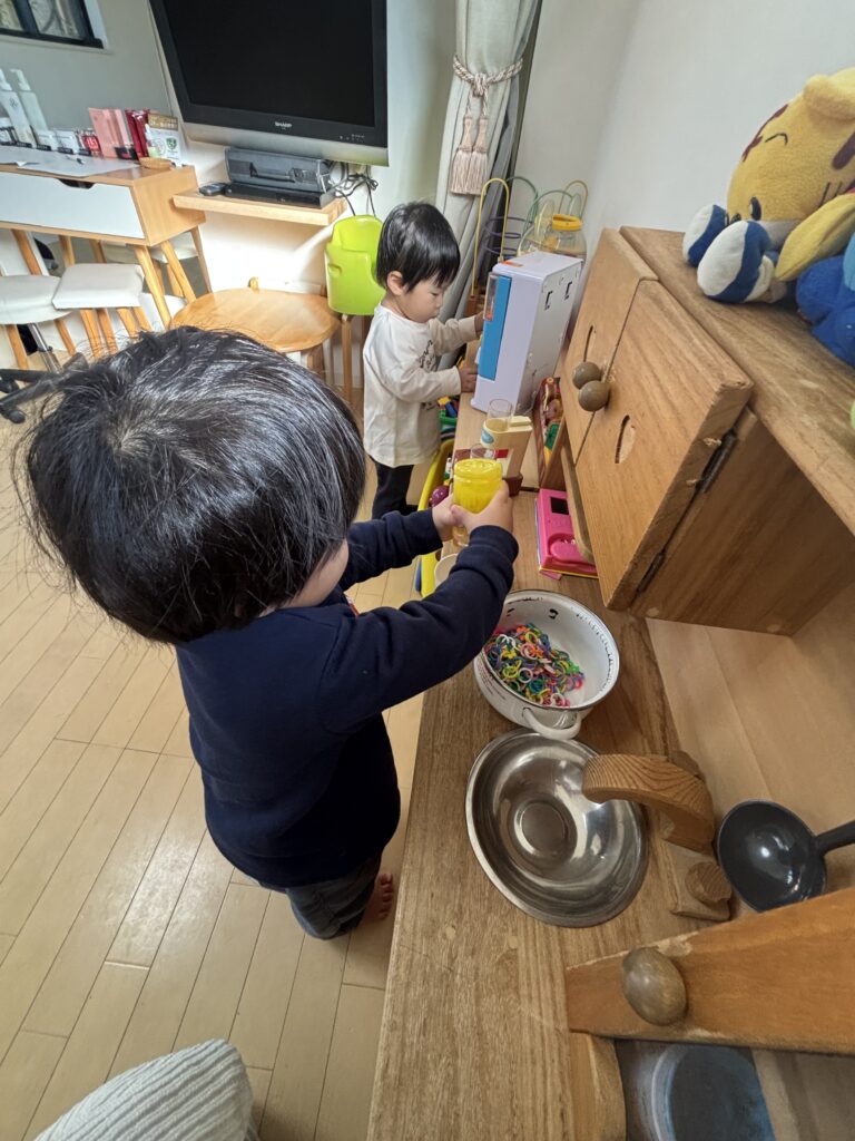 お互い一緒に入室し、お互いの遊びが気になる様子。近くで遊ぶことが多かったです。