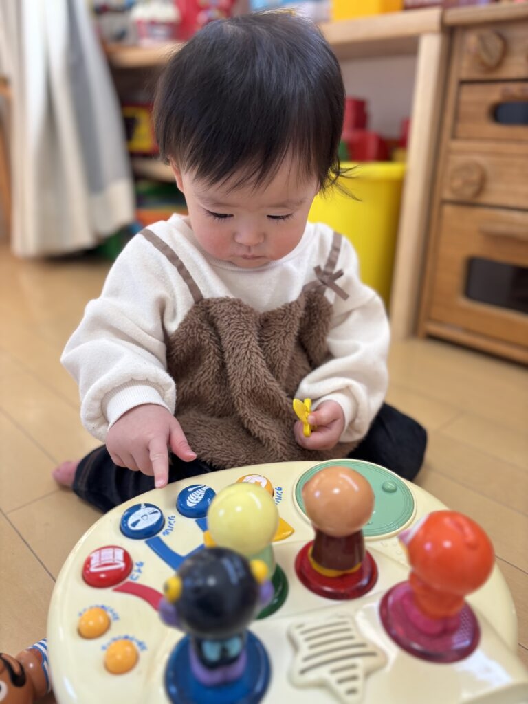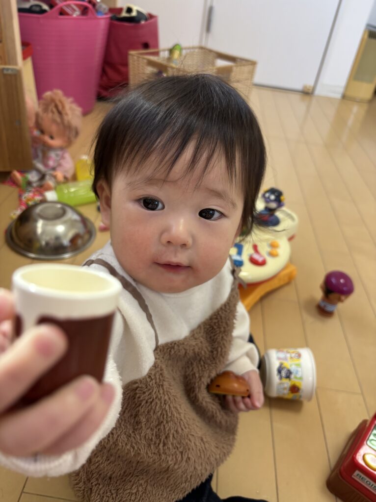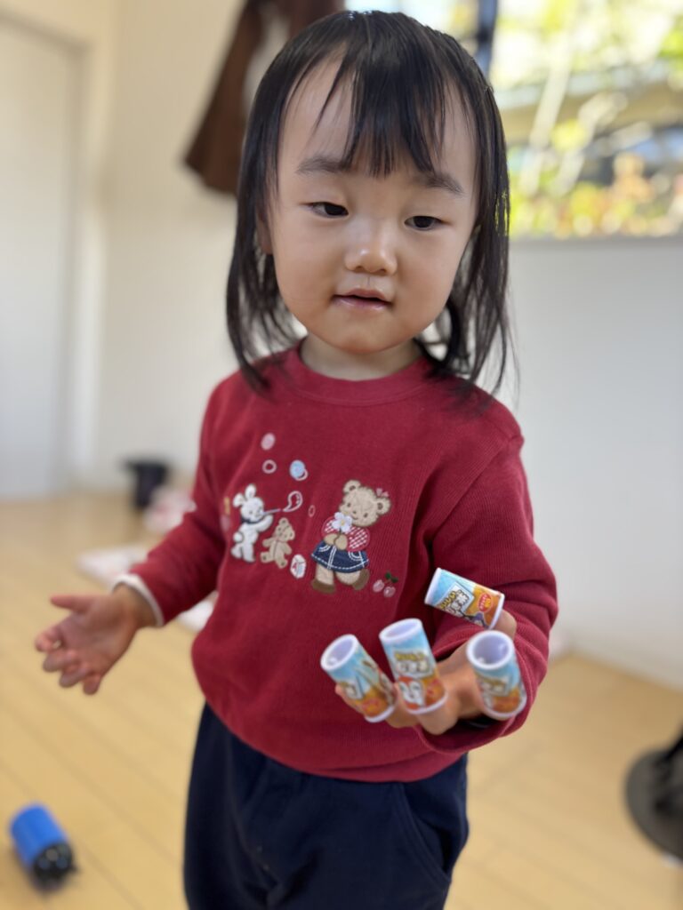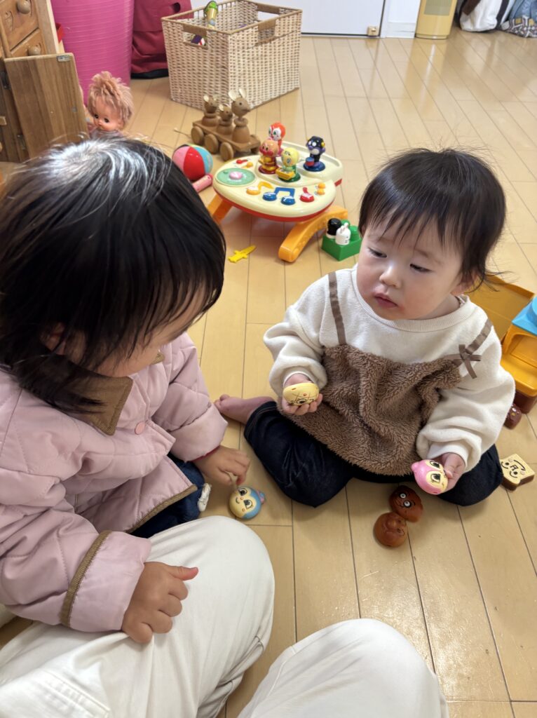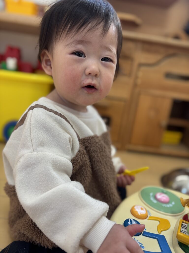 チェーンリングをお皿に入れて混ぜたり、アンパンマンのパンを焼いて持ったきてくれたり、お友達とも仲良く遊べました。お友達がびっくりして一瞬泣いた時は、急いでおもちゃをたくさん持ってきてくれる優しい姿も見られました🩵