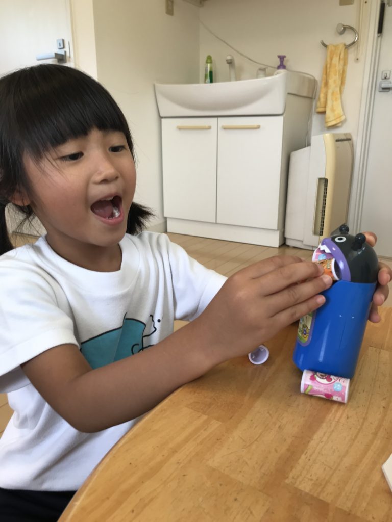 取り出したジュースをバイキンマンのゴミ箱に入れる際
