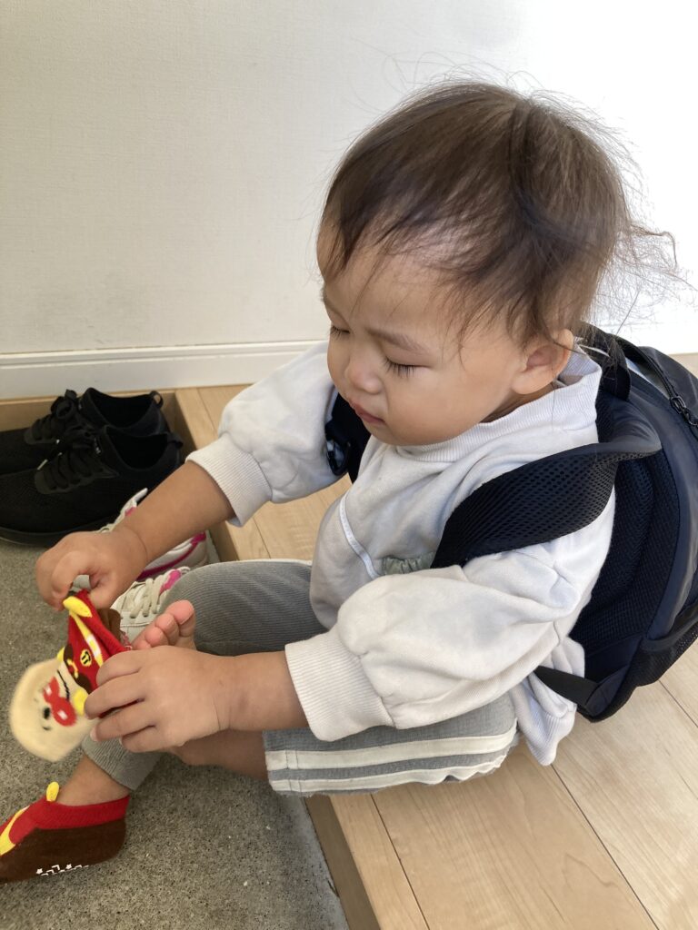 泣いて入室してミカンをいただいたら落ち着いて…その後、自分1人でリュックを背負い、靴下を履いて身支度を整えて『ママのところへ行きたい』と力強くアピールしていました^_^