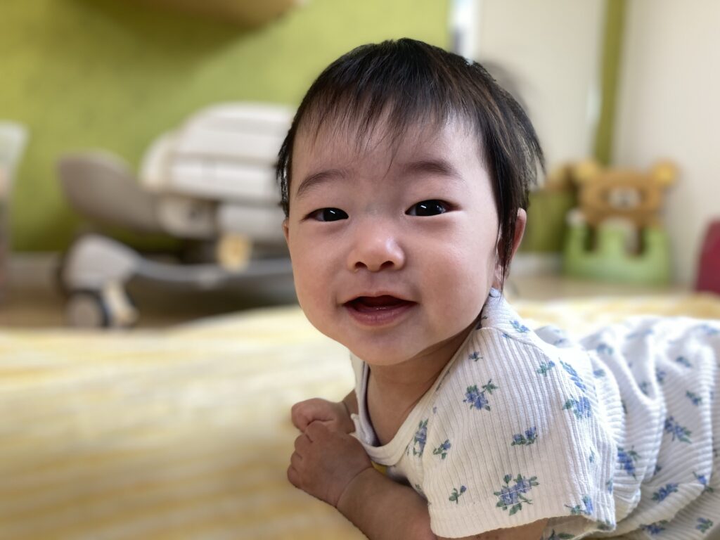 最初からニコニコ♡ ずり這いで動きたい時期みたいで、お布団に降ろした途端、くるっと寝返りして、すぐに探検し始めました♪
