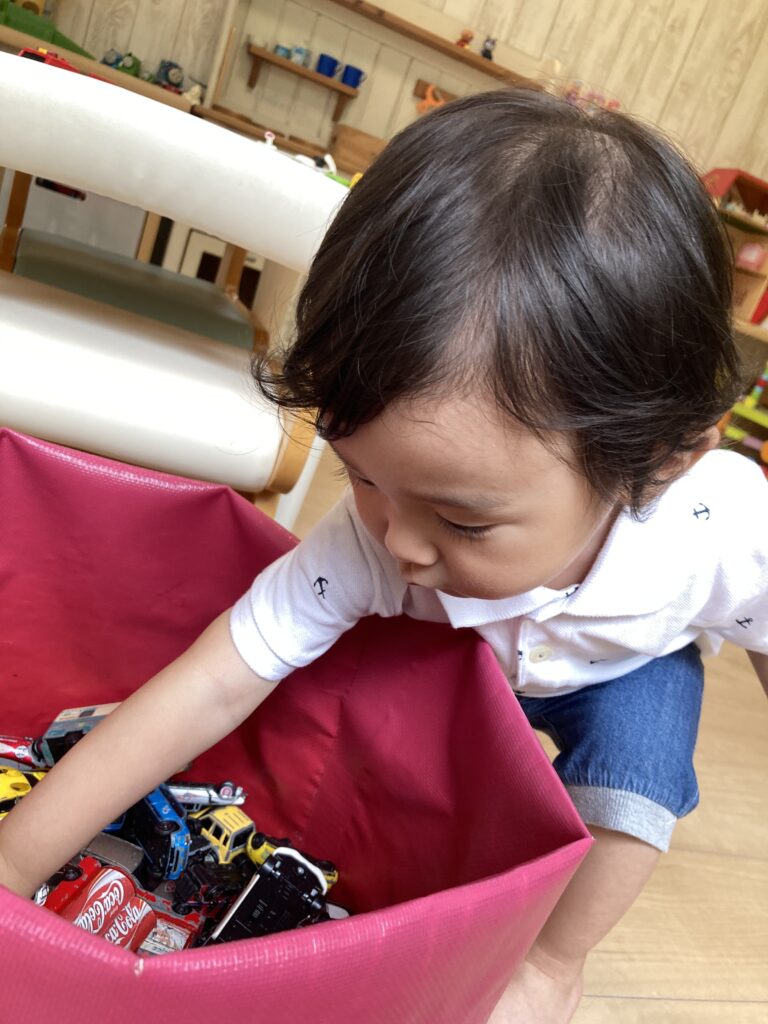 赤ちゃんがいて、ちょっと戸惑っている様子でしたが、トミカで遊び始めました