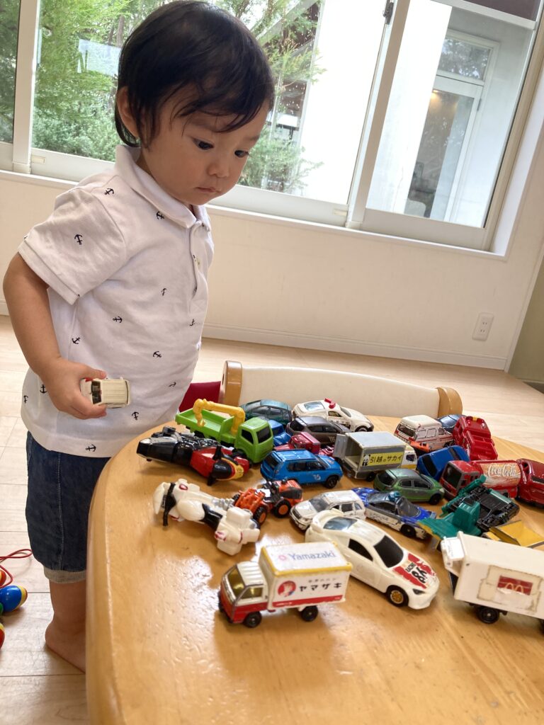 トミカをひとつずつ確認するように見ては、机の上に丁寧に置いていました