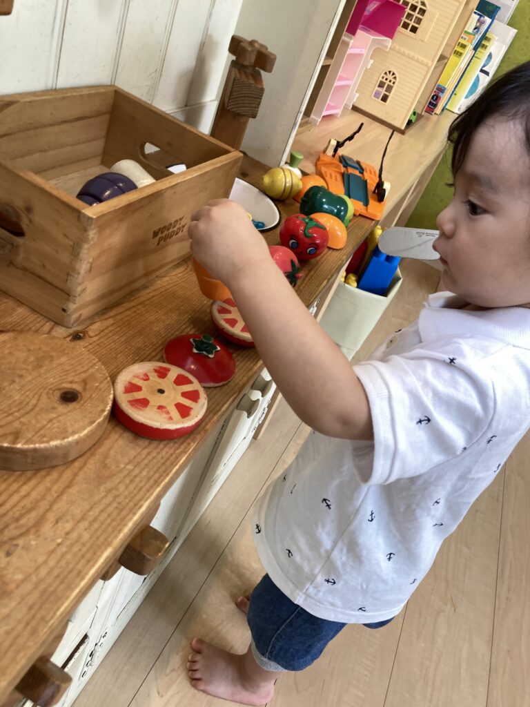 おままごとでも、野菜を出して、そっと置いて、包丁を持ちながらたくさん並べていました