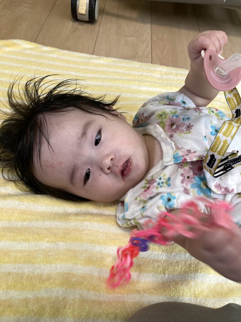 おもちゃをふりふりして足も元気に動かして、遊んでいました